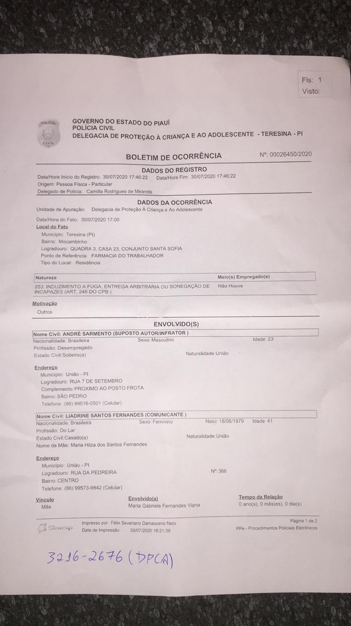 Ainda de acordo com a família, ela não entrou mais em contato, no que motivou aos pais registrar um Boletim de Ocorrência junto à Polícia Civil para que haja a possibilidade de buscas à adolescente. Até o momento a única notícia que tiverem foi por populares que chegaram a ver o casal em uma casa de um bairro de Teresina na segunda-feira (03). Ainda não há notícia do paradeiro de Maria Gabriele.